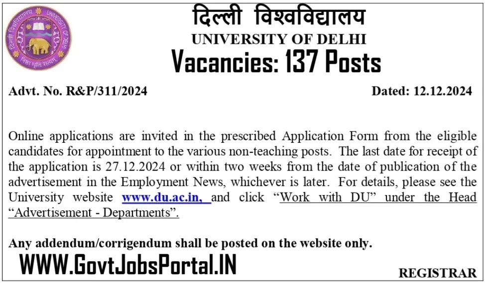 DU Non-Teaching Recruitment Notification has been Released on December 12,